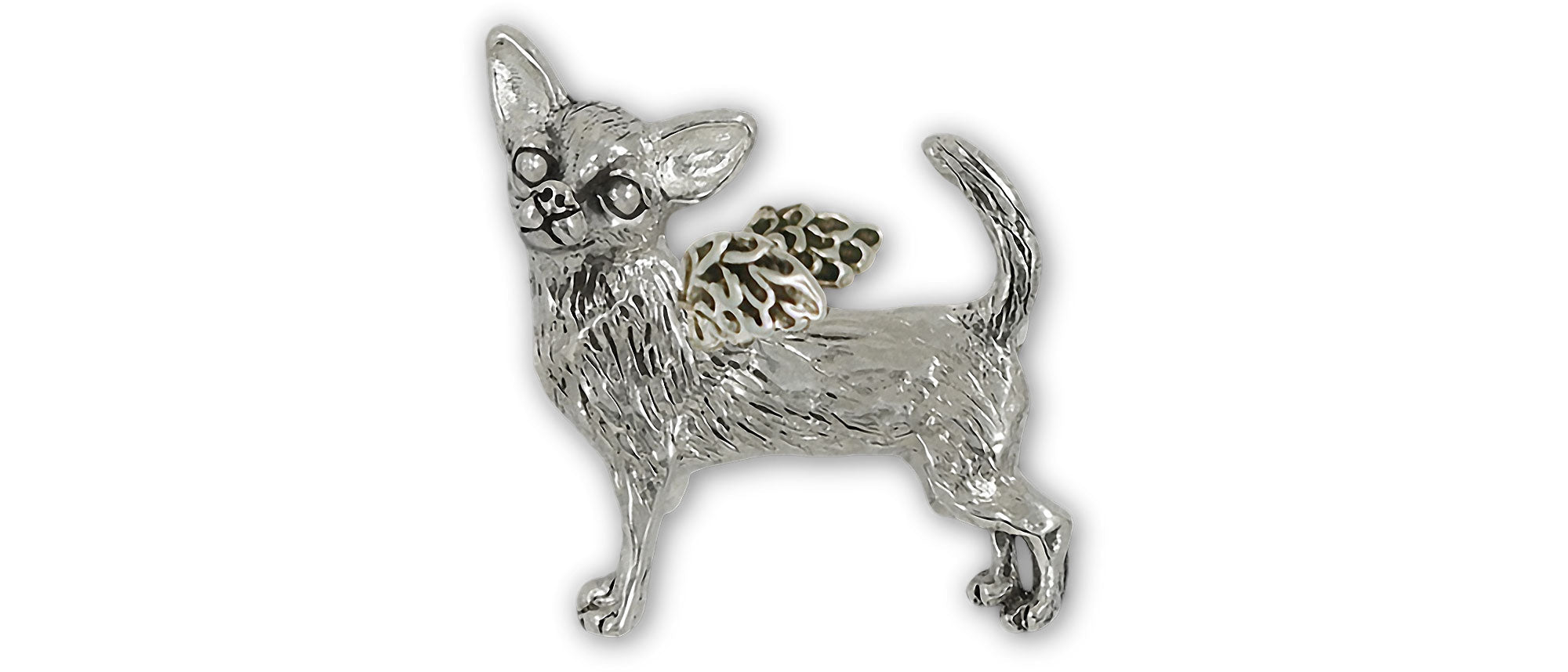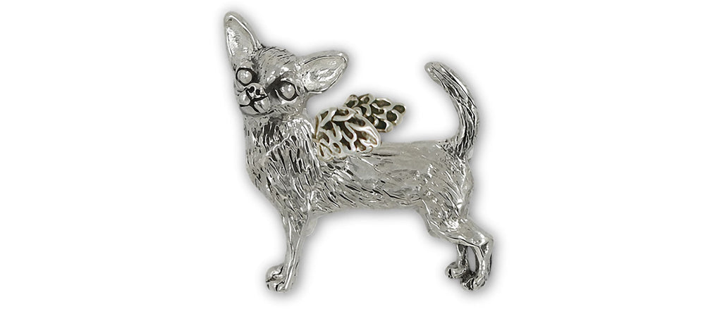 Our handmade Chihuahua Angel Brooch Pin is a perfect way to dress up a blazer or a jacket. Our handmade Chihuahua Angel Brooch Pin is handmade for you and is remarkably detailed. This Chihuahua Angel Brooch Pin is Sterling Silver The Chihuahua Angel is Sterling Silver.
