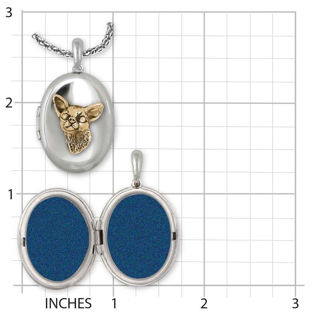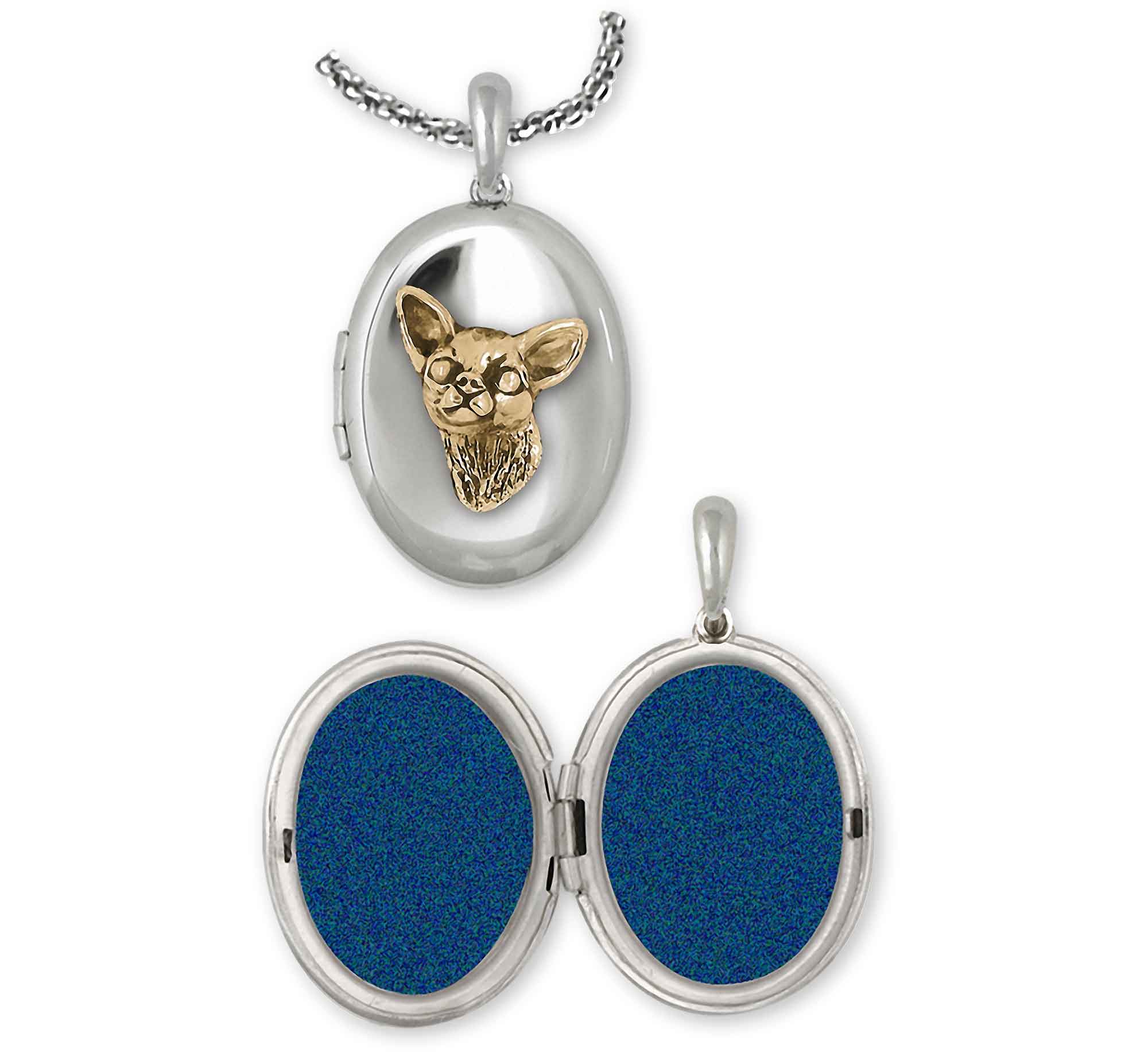 Our handmade Chihuahua Photo Locket is shipped with a quality sterling silver chain. Our Chihuahua Photo Locket is a high quality locket that will hold 2 of your favorite photographs. Optional personalized engraving is also available on the back of our Chihuahua Photo Locket for a special personal touch. We also offer our exclusive photo service... you email us 2 photos for the photo locket and we will retouch them and perfectly size them to fit your photo locket. We will also trim the photos and insert them into your locket before shipping to you, Please contact us for prices. This Chihuahua Photo Locket is Silver And 14K Gold The Chihuahua is Silver And 14K Gold.
