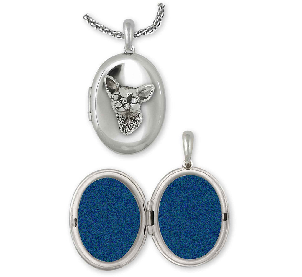Our handmade Chihuahua Photo Locket is shipped with a quality sterling silver chain. Our Chihuahua Photo Locket is a high quality locket that will hold 2 of your favorite photographs. Optional personalized engraving is also available on the back of our Chihuahua Photo Locket for a special personal touch. We also offer our exclusive photo service... you email us 2 photos for the photo locket and we will retouch them and perfectly size them to fit your photo locket. We will also trim the photos and insert them into your locket before shipping to you, Please contact us for prices. This Chihuahua Photo Locket is Sterling Silver The Chihuahua is Sterling Silver.