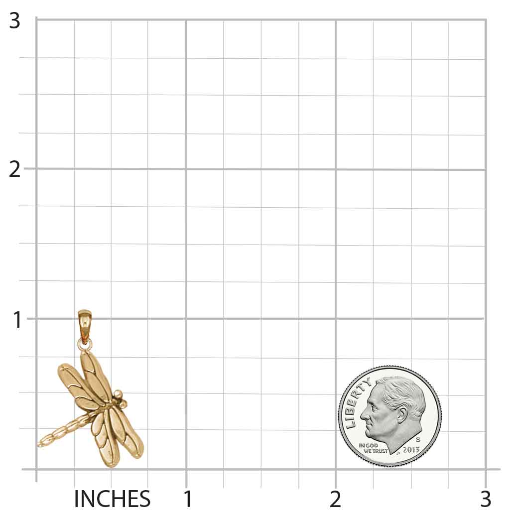 Our Dragonfly Pendant weighs approximately 2.5 grams. This design measures approximately 11/16 inch high (17.5 mm) .