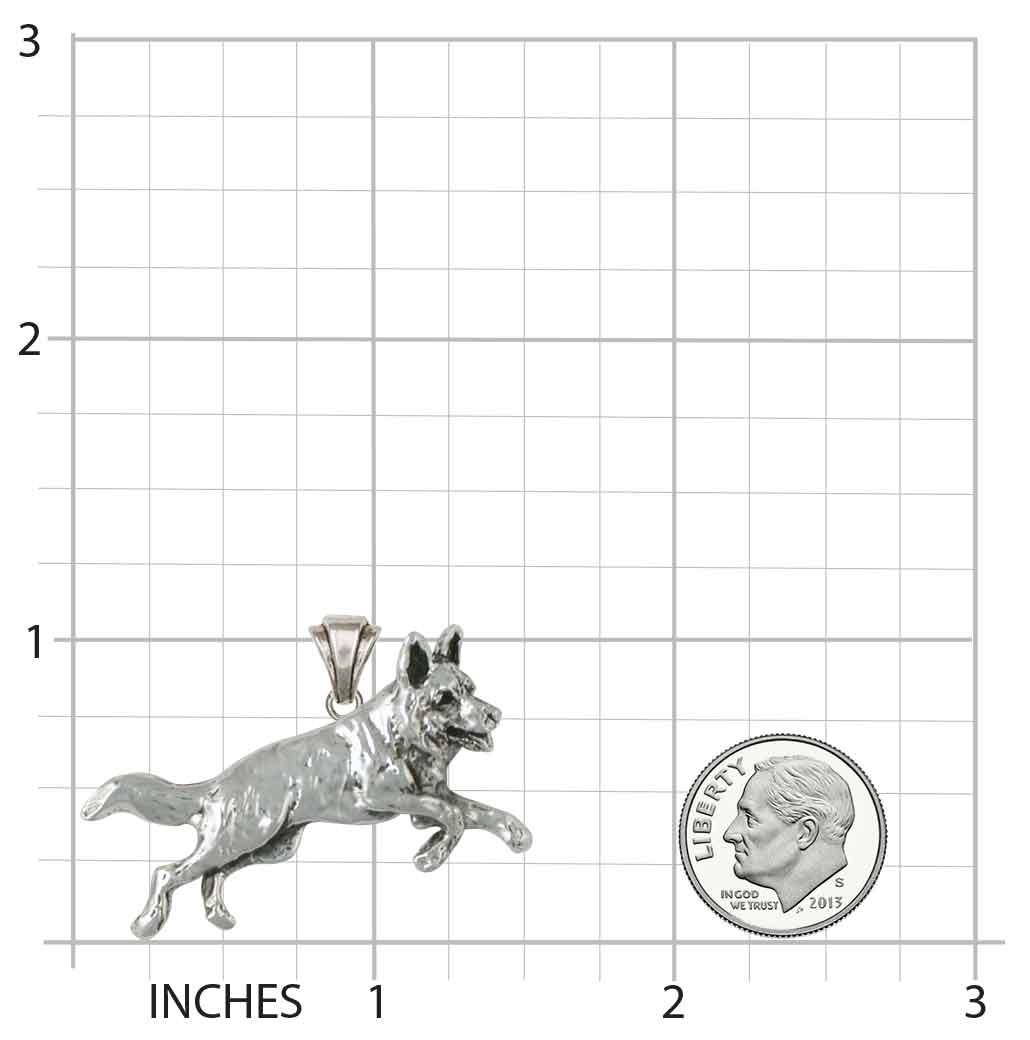 Our handmade German Shepherd Pendant jewelry is perfectly detailed and is a wonderful addition to any necklace chain. This German Shepherd Pendant is Sterling Silver This German Shepherd design is hand cast in .925 sterling silver. Our German Shepherd Pendant weighs approximately 9.4 grams. Please contact us if you are interested in gold or gold vermeil prices for this German Shepherd Pendant.The German Shepherd design is approximately 1 1/2 inch wide.