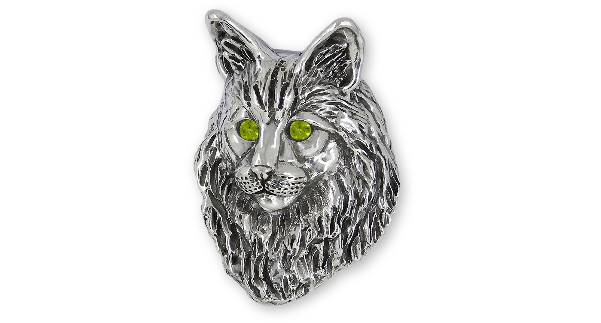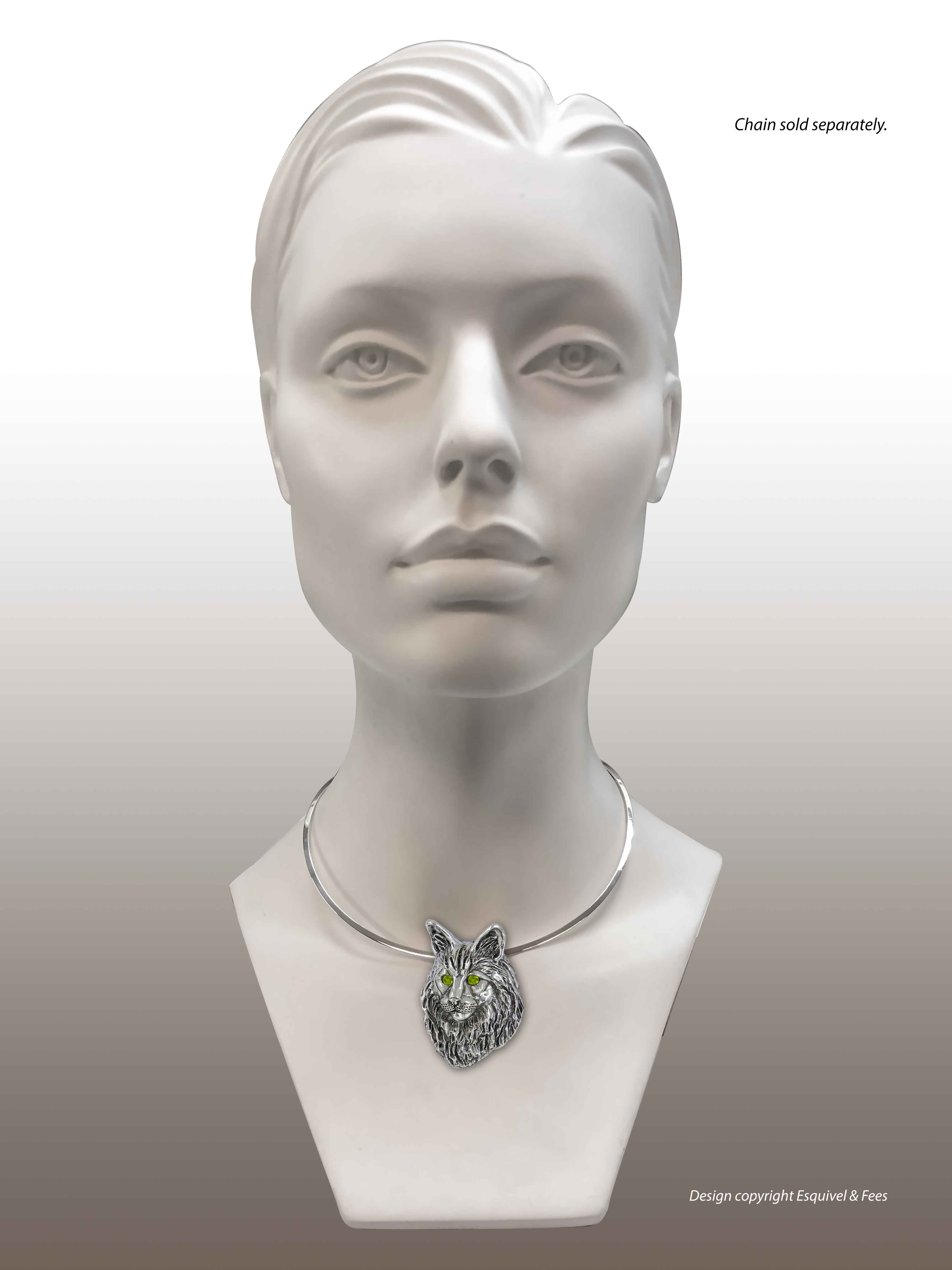This is an original handmade Esquivel and Fees Maine Coon Pendant jewelry design. Our Maine Coon Pendant jewelry is hand cast, when you place your order, using the lost wax casting process and is hand finished. Please allow extra time while we make these for you. This is accented with Peridot Austrian crystal eyes This Maine Coon design is hand cast in .925 sterling silver.