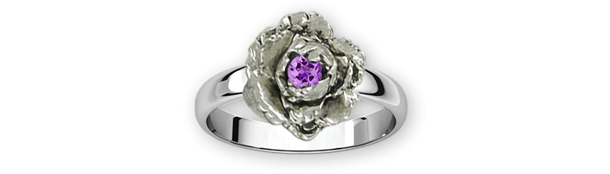 This is an original handmade Esquivel and Fees Peony Birthstone Ring jewelry design. Our Peony Birthstone Ring jewelry is hand cast, when you place your order, using the lost wax casting process and is hand finished. Please allow extra time while we make these for you. This design is accented with your choice of imitation birthstone. Genuine stones are available on request. This Peony Birthstone design is hand cast in .925 sterling silver.