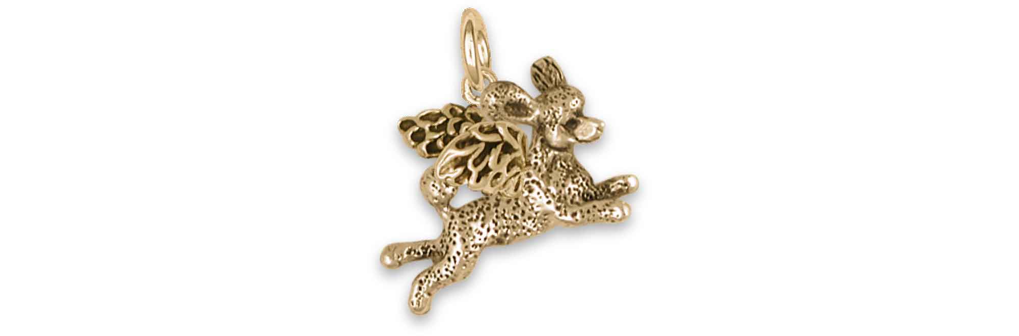 Our handmade Poodle Angel Charm is a perfect addition to your charm bracelet. If you have a slide bracelet, we can also ship this with a special top to fit your slide bracelet. Our Poodle Angel Charm weighs approximately 6.2 grams. Please contact us if you are interested in gold prices for this Poodle Angel Charm.Our Poodle Angel Charm measures approximately 15/16 inches wided and is finished in 14k gold vermeil.