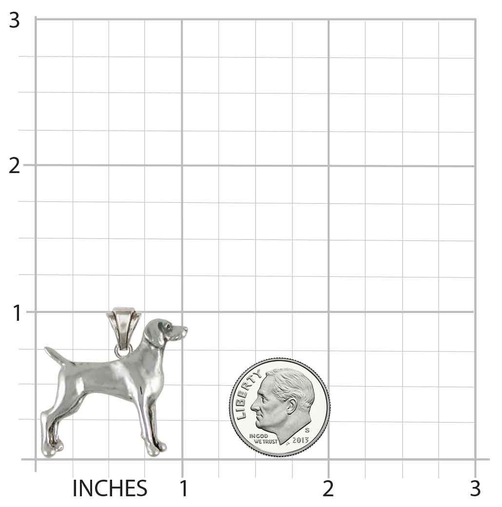 Our Weimaraner Pendant weighs approximately 6.8 grams in sterling silver. This design measures approximately 1 inch wide (25.4 mm) .