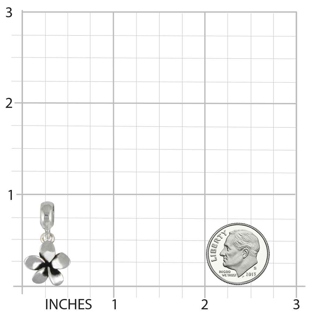 Our handmade Plumeria Charm Slide is hand cast and handmade when you place your order. This Charm Slide is shipped with a special top ring that is designed to slide onto your favorite slide style charm bracelet. This charm will fit a Pandoraå¨ style slide bracelet. This Plumeria Charm Slide is Sterling Silver This Plumeria design is hand cast in .925 sterling silver. Our Plumeria Charm Slide weighs approximately 2.184 grams in sterling silver. This design measures approximately 1/2 inch high. This is also available in 14k gold and 14k gold vermeil. Please contact us if you are interested in gold or gold vermeil prices for this Plumeria Charm Slide.The Plumeria design is approximately 1/2 inch high.