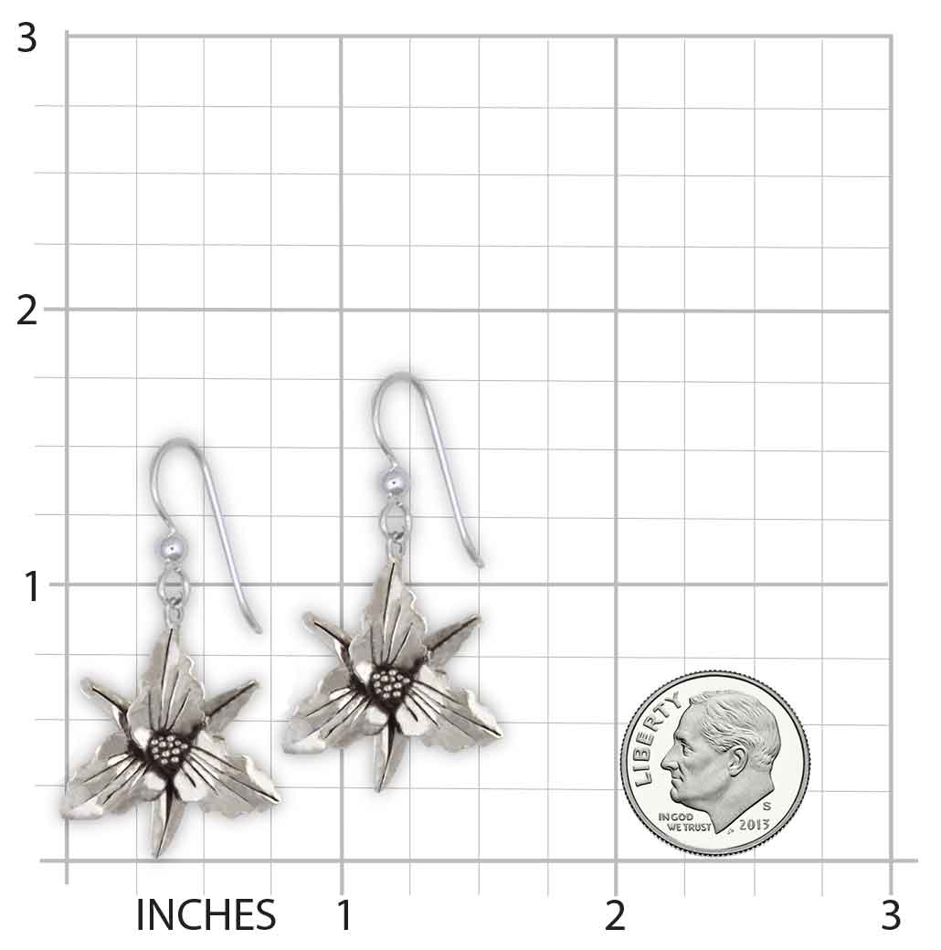 Our handmade Trillium Earrings are perfectly detailed. We offer hypoallergenic surgical steel post backs, French ear wires and leverback ear wires. If you require a special earring type, please contact us. These Trillium Earrings are Sterling Silver Our Trillium Earrings weigh approximately 6.16 grams in sterling silver. These measures approximately 7/8 inch high. They are also available in 14k gold and 14k gold vermeil. Please contact us if you are interested in gold or gold vermeil prices for these Trillium Earrings.The Trillium design is approximately 7/8 inch high.